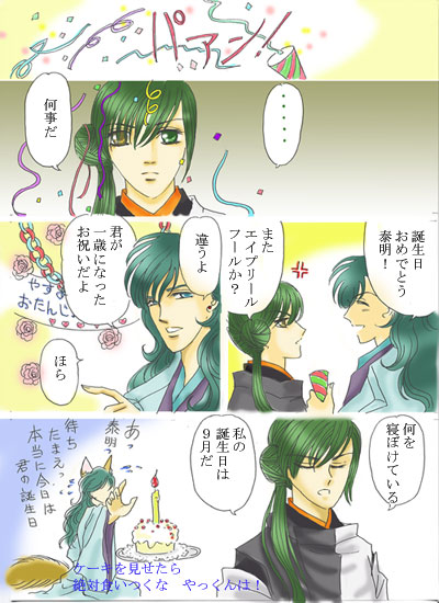 ・遙か(友雅×泰明、頼久×泰明、天真×泰明、晴明×泰明、天狗×泰明、アクラム×泰明、泰明×神子←(これは不本意ながらうっかり買ってしまったもの)、オールキャラギャグ・・・・以上かな。何しろ遅れてきたから泰明受けの本を手に入れるのはとても大変なのですよ~。まん○らけとかネットオークションとか見ていても中々出て来ないし、必ずライバルがいるし(泣)。