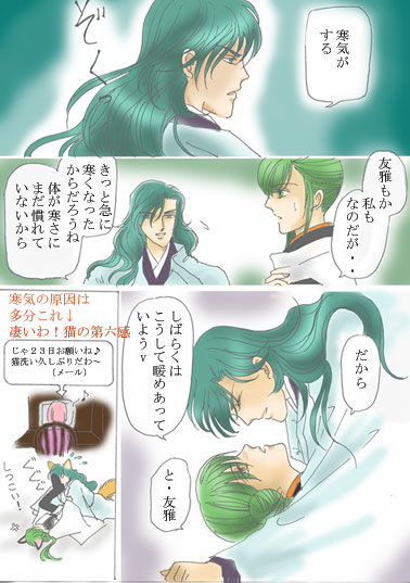 おまけに友さんたら、やっくんの肩に手をかけたと思ったら首筋を噛んで××の体勢に入ろうとして(おおっ♪)って見ていたら、さらりとやっくんにかわされて・・・・良い物を見させて頂きましたv