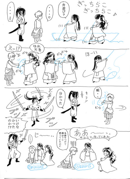 その様子を唖然として見ていた頼久も加わるように強制され、先頭で漕ぎ始めたら後ろの3人「ザッザーン」と掛け声だけで頼久一人にやらせて、頼久舟を漕ぎながら退場。